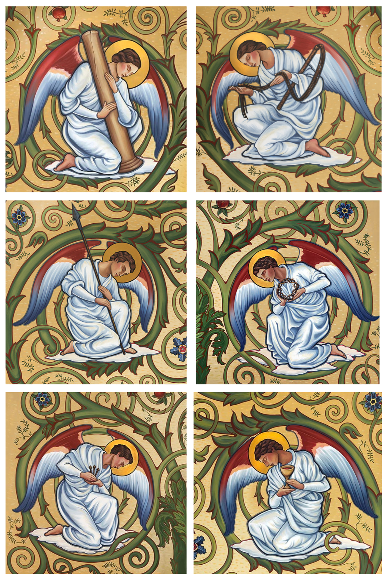 This image is an excerpt from a larger sacred art mural. The original mural, commissioned for St. Joan of Arc Catholic Church in Phoenix by Fr. Dan Connealy, presents the adoring angels reverently holding the Instruments of the Passion: the Column of Scourging, the Spear of Longinus, the Nails, the Whip, the Cup of Suffering, and the Crown of Thorns.